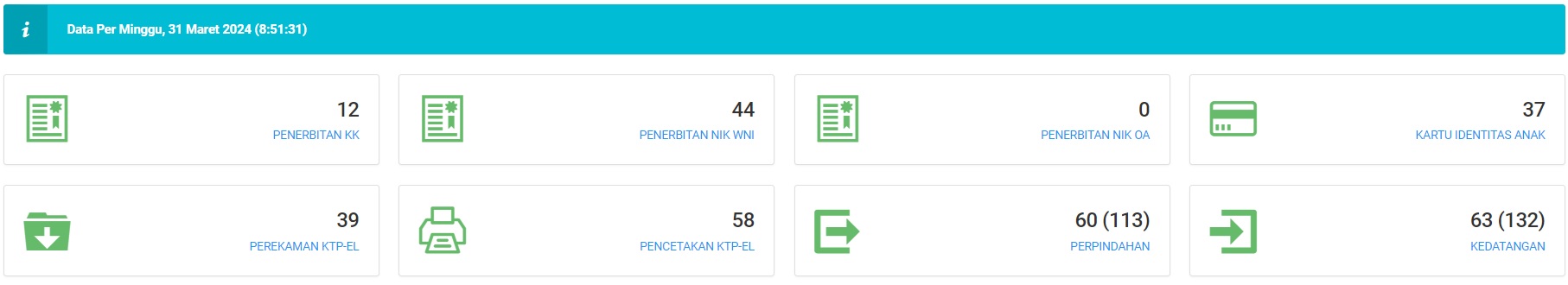 Total Pelayanan Pendaftaran Penduduk dan Pencatatan Sipil Data Per Minggu admin 01/04/2024 Posted in Galeri Informasi Author: admin