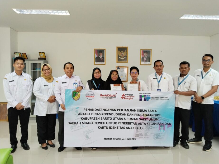 Agar lebih meningkatkan dan mempermudah pelayanan kepada masyarakat dalam pengurusan dokumen Kependudukan untuk mendapatkan layanan kesehatan, Dinas Kependudukan dan Pencatatan Sipil Kabupaten Barito Utara bersama RSUD Muara Teweh pada hari Rabu, 4 Juni 2025 melaksanakan penandatanganan Perjanjian Kerja Sama (PKS) yang mencakup layanan Penerbitan Akta Kelahiran dan Kartu Identitas Anak (KIA) yang dilakukan secara langsung oleh Plt. Kepala Dinas Dukcapil Kabupaten Barito Utara Hj. Nurhamidah, S.P dan Direktur RSUD Muara Teweh dr. Tiur Maida.