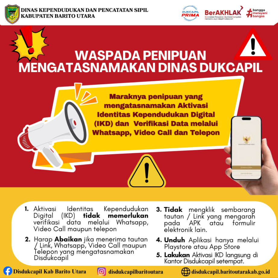 WASPADA PENIPUAN BERKEDOK VERIFIKASI DATA DAN AKTIVASI IKD admin 03/11/2025 Posted in Galeri Informasi Author: admin