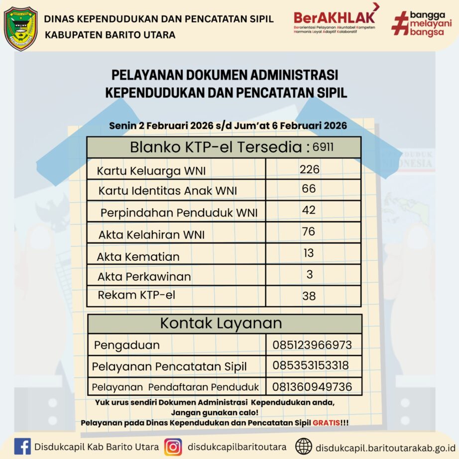 PELAYANAN ADMINISTRASI KEPENDUDUKAN DAN PENCATATAN SIPIL admin 06/02/2026 Posted in Galeri InformasiDOKUMEN TERBIT PADA 2 FEBRUARI s.d 6 FEBRUARI 2026 Author: admin