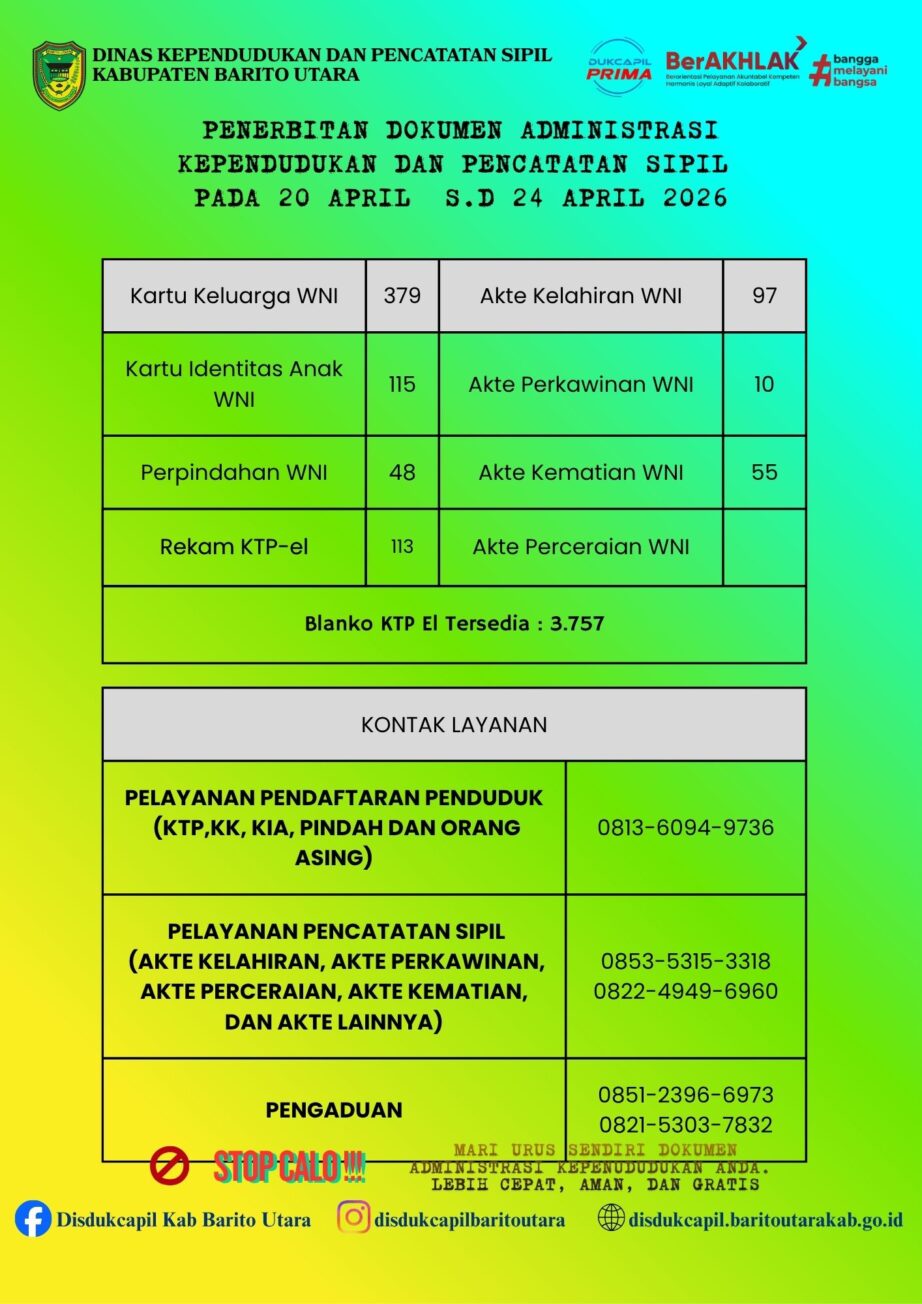 PENERBITAN DOKUMEN KEPENDUDUKAN TANGGAL 20 APRIL SAMPAI DENGAN 24 APRIL 2026 admin 27/04/2026 Posted in Galeri Informasi Author: admin